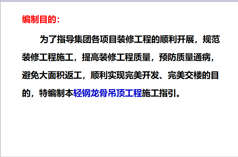 轻钢龙骨吊顶工程施工工艺指引主要说明轻钢龙骨吊顶材料、施工工艺流程、关键工序注意事项、验收质量标准、常见的质量问题及处理方