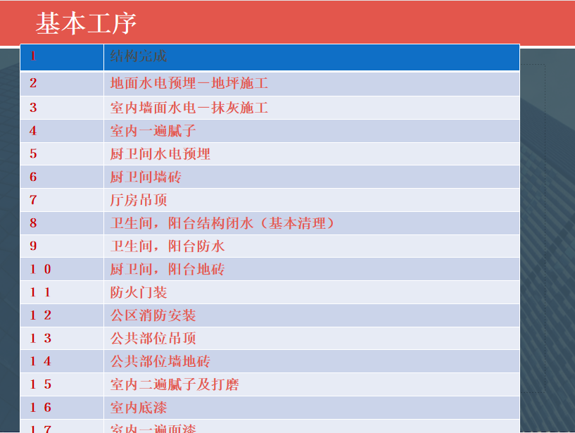 地坪施工:室内标高-水电预埋-出灰饼-地坪施工、室内标高是关键,确定室内标高既保证地坪施工又要满足室内净高的要求、根据标高确定地面开槽水电预埋深度,出灰饼、地坪施工的质量要求;