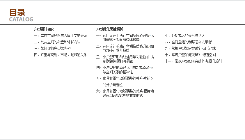 户型设计研究与优化思维解析包括:室内空间尺度与人体工学的关系、公共空间的布置和计算方法、如何评价户型优劣势、户型与规划、市场、地域的关系。