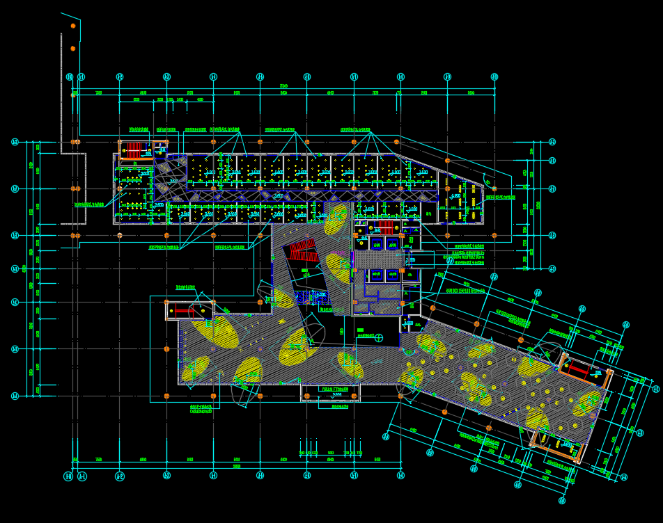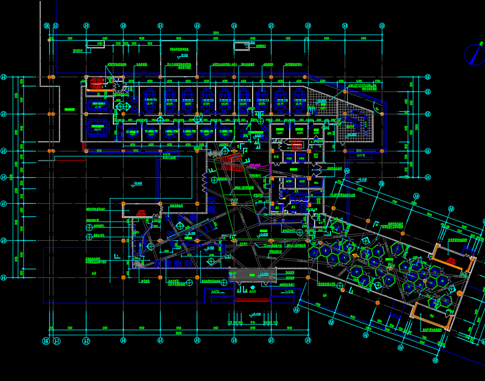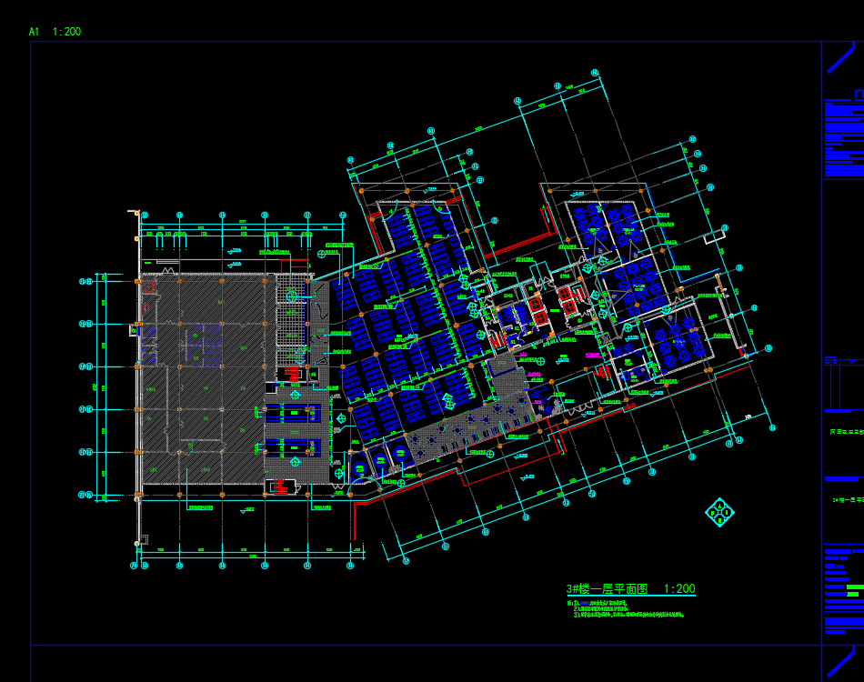 多栋办公楼室内装修施工图纸包括了一层平面图、地面拼花图、一层顶面图、地面铺装图、隔墙定位图、天花尺寸图、中庭节点图、电梯厅立面图、3#二层餐厅立面图、3#楼一层培训区立面图等。