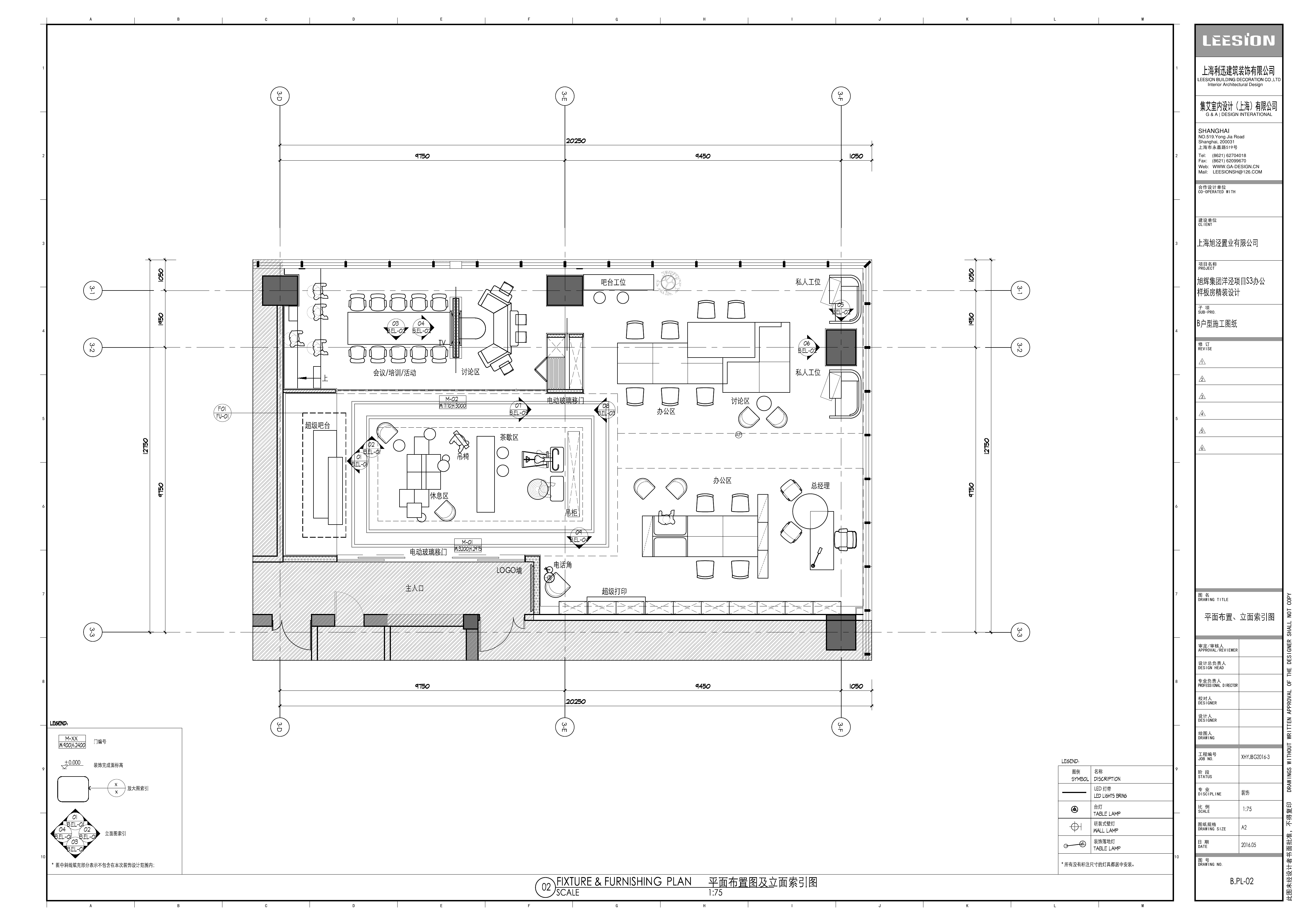 240平方米现代办公空间样板房装修施工图包括:原始建筑平面图、平面布置图及索引图、隔墙定位图、地面材质图、综合天花图、灯具及天花造型定位图、灯具控制图、配电分布图等。